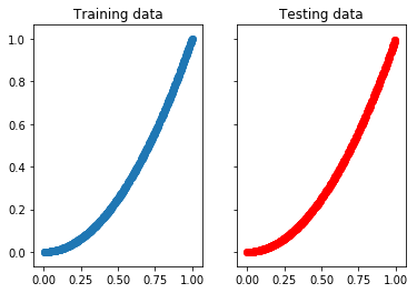 To create some sample data manually, I used 1000 linearly spaced values between 0 and 1. Then shuffled all this data and used the first 500 for training and the other 500 for testing. By doing that, we make sure that test and training data doesn’t overlap and at the same time have a similar distribution. If you look at the scatter plot, they look very much identical but the actual values are 100% different.
