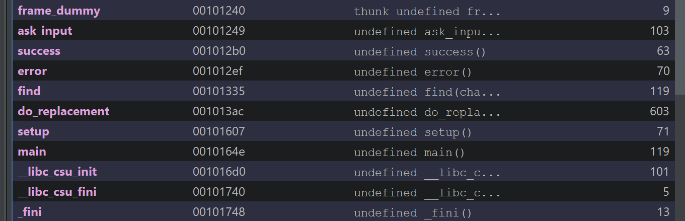 Looking at Ghidra, there are not many functions that we need to investigate: