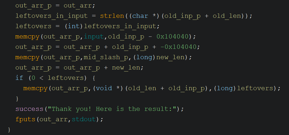 Here the binary calculates how many leftover bytes remain in the input after the replacement match; this value is used in the third memcpy. The first memcpy copies bytes from the input up to the start of the old string, the second memcpy copies the new replacement string, and the third copies the leftover bytes. Let’s walk through the bytes from the previous section to see how each of these operations plays out.