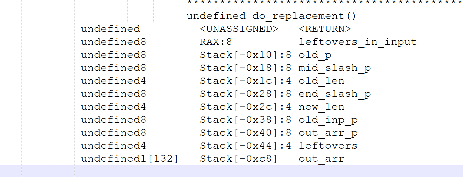 After looking at the decompilation output, there was only one function we needed to deal with: do_replacement. The other functions didn’t seem to have any bugs or issues we could make use of. I tried to clean the output in Ghidra a bit to make it easier to read: