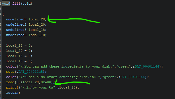 Now looking at functions and how the binary executes, it is a fairly simple binary. Important parts are when the binary takes input from user, these are the places that could have a vulnerability we can utilize. Going through functions main, fill, drink, color in ghidra decompiled view, I can see a critical issue in fill function: