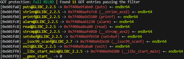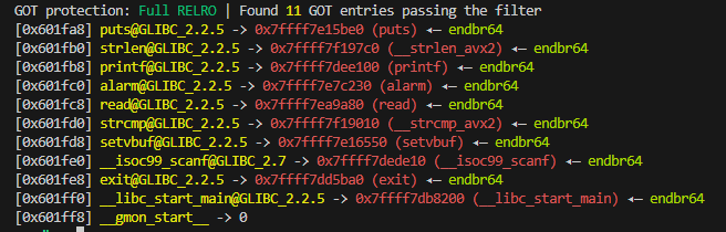 As I mentioned, libc will probably be in a different address each time the binary runs due to ASLR. One way to see this is using the debugger and looking at entries at GOT which should point to addresses of libc functions. Using pwndbg’s got command after running the binary at two different runs: