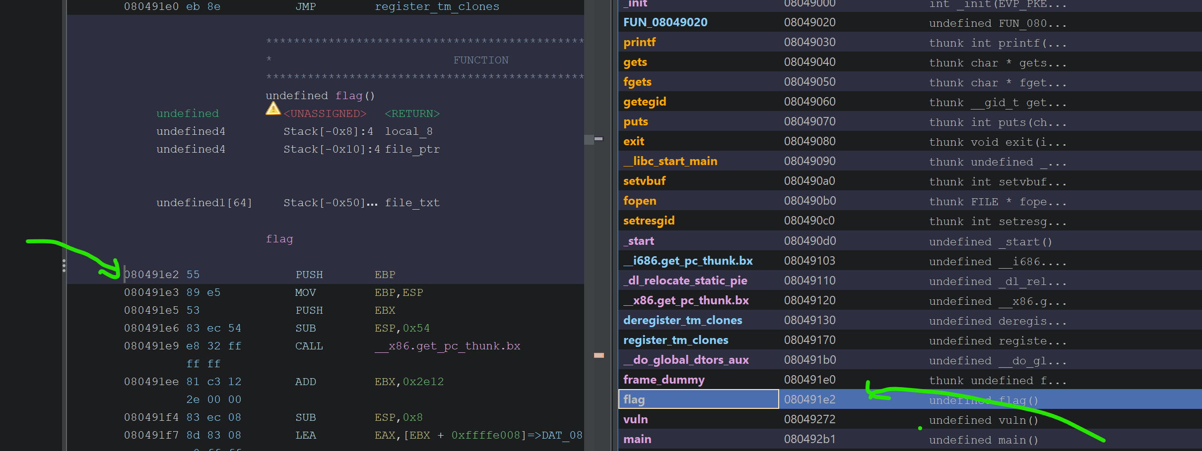 This means by overflowing the buffer and overriding the return address we can return to any place! This place could be a library function, another function in the binary, or just any arbitrary position in the code. That is quite a powerful tool to utilize, but we have to know the address we want to return to. Looking at other functions in ghidra, we can see there is a function called flag: