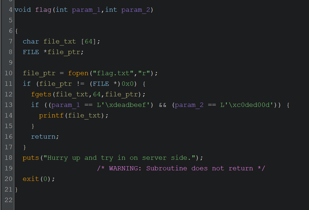 Very interesting function. I have done a bit of clean up on ghidra’s decompile output, but nevertheless it is quite easy to understand. The function takes two parameters. If the right parameter values are given, it reads the flag file and prints the contents of the file. We found our target function to return to. Now to be able to return to this function and get it to print the contents of the flag file: