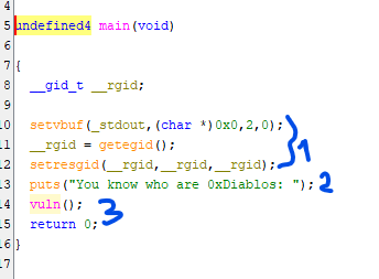 Looking at the decompiled code, I could see two interesting functions: vuln and flag. Here we are looking at the main function. The first part I marked can be ignored; it is a very common pattern used in pwn challenges to make standard output flush quicker. It then prints a text in the second marked place with puts, and then calls the vuln function. So looking at this main, there is nothing important here that can be exploited. So we move to the vuln function.