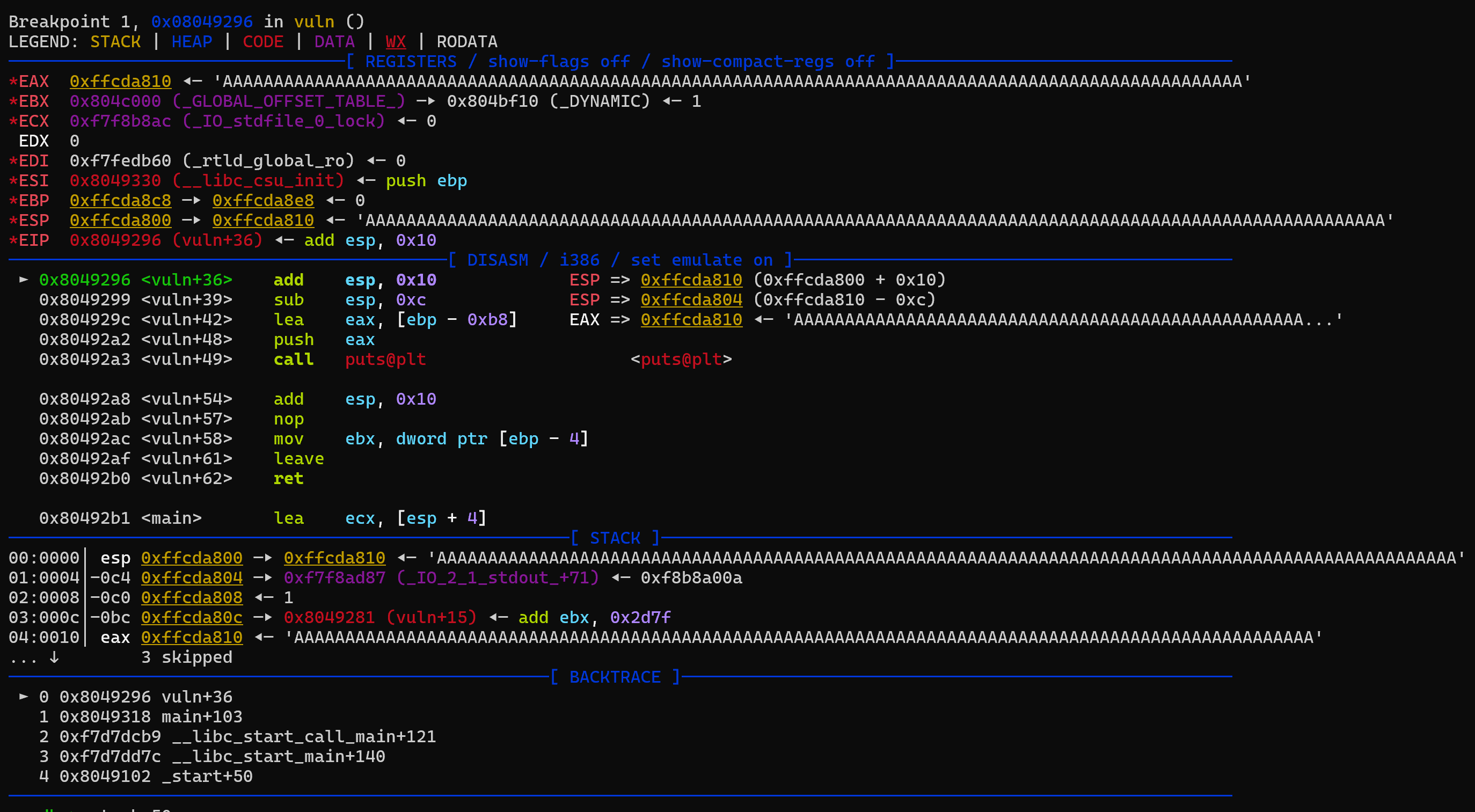 Most of the script is from the pwntools template generator. I modified it to run under WSL and added the breakpoint line. To find where to stop and debug the binary, I looked at the disassembled code and decided to stop right after the gets function finishes in the vuln() function. At that point, our input should be on the stack and visible. If pwndbg is set up properly, when GDB is launched it should update to the pwndbg console which has many more tools than a pure GDB debugger. To run the script: python3 solve.py GDB and then c/continue to start the execution in the debugger. Hopefully you will get the debugger to stop at *vuln + 36: