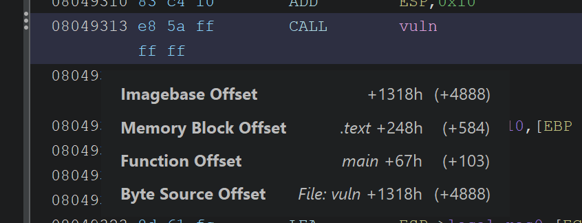Looking at this, the stack does indeed have our input, but since the buffer isn’t really small, we can’t really see the return address we are looking for on the stack. By the way, the return address we are looking for on the stack can be found easily in the disassembler window by looking at the next instruction after the vuln function call: