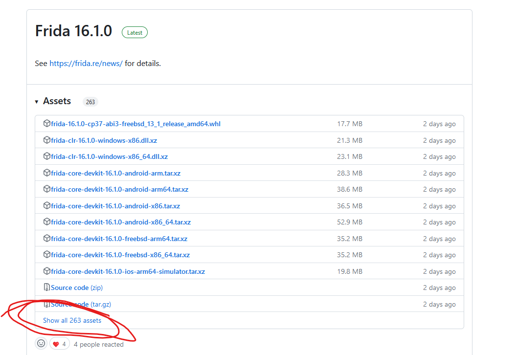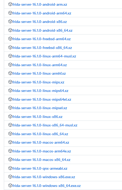 But don’t worry, it is quite simple. Releases contain various binaries, source code, dlls etc., we are only interested in frida-server for our purposes:
